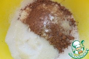 Смешиваем в отдельной миске сухие ингредиенты - просеянную муку, какао-порошок, соду, ванильный и обычный сахар.