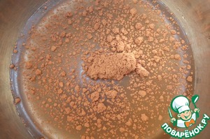 В кастрюльке смешиваем воду, сахар, какао. Ставим на небольшой огонь, доводим до кипения. Продолжая помешивать, доводим смесь до загустения. -