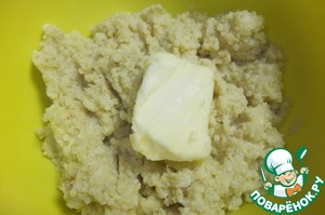 В горячую кашу добавляем сливочное масло, тщательно перемешиваем и даем немного остыть.