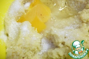 В остывшую кашу добавляем яйцо, сахар. Перемешиваем.