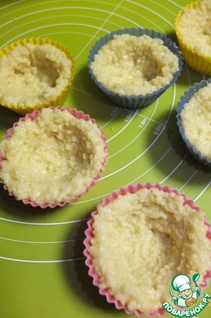 В силиконовые формочки кладем примерно по половине столовой ложки каши и распределяем ее по формочке, формируя корзиночку. Я настоятельно рекомендую использовать именно силиконовую форму, чтобы в дальнейшем легче было вытащить корзиночки.