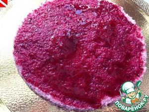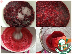 Приготовим ягодный соус: ягоду (можно замороженную), сахар и воду поместить в сотейник, нагревать на среднем огне, пока ягода не станет мягкой. Снять с огня, слегка охладить, пробить блендером, процедить через сито и оставить до полного остывания.