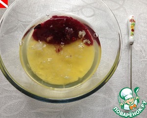 Смешать 5 ст. ложек получившегося ягодного соуса, белки, сгущенное молоко, ваниль. При желании добавить пищевой краситель (я не добавляла).