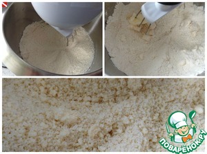 Размягченное сливочное масло разрезать на 12 кусочков. В чаше миксера (насадкой для жидкого теста) на низкой скорости смешать муку, крахмал, сахар, разрыхлитель и морскую соль. По одному кусочку добавлять сливочное масло, пока смесь не превратится в мелкую крошку.