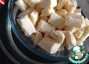 Готовим крем. На водяной бане растопить белый шоколад. Убрать с огня, но оставить его на бане.