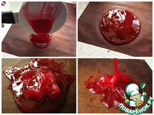 Сборка. Желатин замочить в воде до набухания, затем распустить в микроволновке и добавить в оставшийся ягодный соус. На первый корж выкладываем половину ягодного соуса, накрываем вторым коржом. Кладем примерно 1 см шоколадного крема. Далее: третий корж - ягодный соус- 4 корж. Оставшийся крем наносим на торт, ставим в холодильник до полного застывания крема, примерно на 1 час. Украшаем замороженной ягодой и сахарными спиральками.