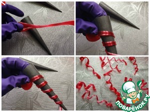 Берем небольшой кусочек массы и творим. Я сделала простейшие спиральки - наматывала сахарную массу на конусы для трубочек. Концы обрезаем обычными ножницами. Снимаются спиральки отлично, но следует помнить, что застыв, они становятся хрупкими. Работать нужно очень быстро, масса быстро теряет температуру и застывает. При наличии газовой горелки ее можно снова немного подогреть и продолжать творить.