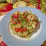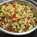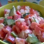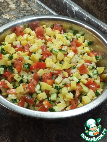 Болгарский перец, помидор и огурец (если у огурца плотная кожура, то лучше ее снять) нарезать небольшими кубиками.