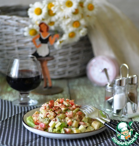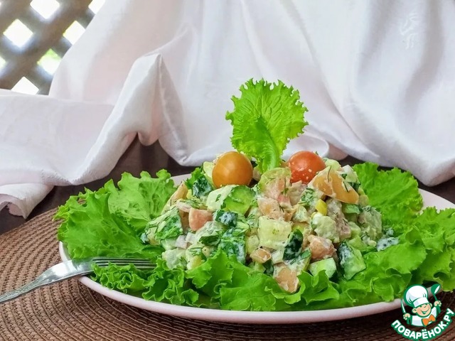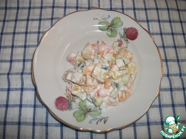 Овощи полить растительным маслом, приправить солью и перцем, заправить крем-фрешем, тщательно перемешать. (При отсутствии крем-фреша его можно заменить на жирную сметану или сливки. Хотя у нас в магазинах этот продукт можно найти). Выложить на салат. Поставить в холодильник минимум на 1 час.