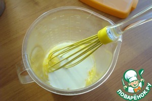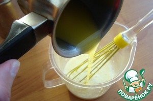 Маргарин растапливаем и тонкой струйкой, постоянно помешивая венчиком, вводим в смесь.