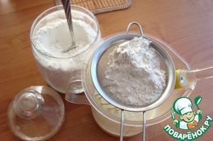 Муку просеиваем с разрыхлителем через сито по 1 ложке и хорошо соединяем.