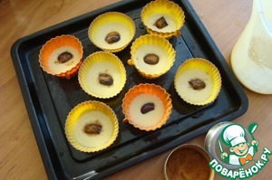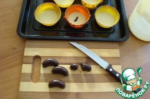 Берём формочки для кексов. У меня силиконовые, я их просто намочила. Разлила половину теста в формочки. Конфеты разрезала пополам.
