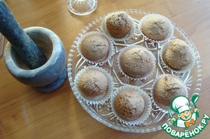 Кексам дала остыть и вынула их из форм на бумажные формочки. В ступке разбила сахар до пудры и добавила немного какао-порошка. Через сито их посыпала.