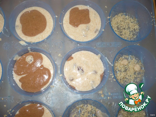 Формочки смазываем, низ посыпаем измельченными орехами или кокосом, наполняем 2/3тестом и печём 25 минут при температуре 200 градусов.