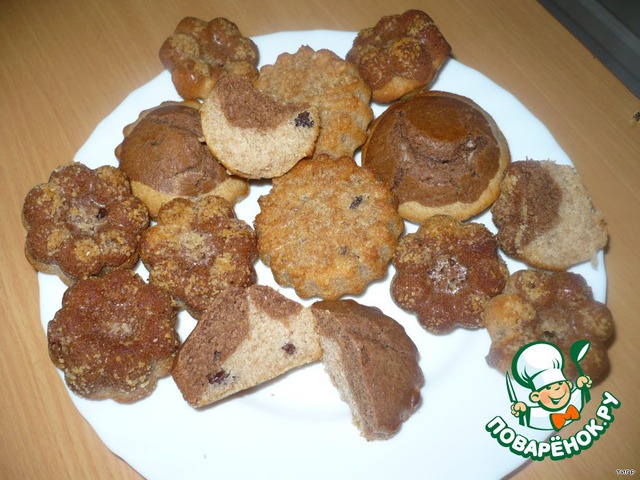остальные продукты в другую миску, взбиваем, тесто разделим на две половины. Добавляем по вкусу/какао, орехи,/измельченные/изюм, кусочки шоколада, и.т.д./перемешаем.