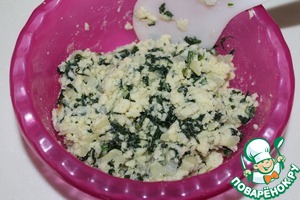 В отдельной миске смешать пшено, лук и шпинат. В другой посуде взбить яйца, молоко, тимьян, соль и перец. Влить яичную смесь в пшено и хорошо перемешать. Добавить половину тертого сыра и еще раз перемешать.