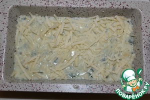 Подготовить ингредиенты. Пшено отварить на воде до полуготовности. Шпинат мелко порезать. Лук обжарить на растительном масле до золотистого цвета. Сыр потереть на крупной терке.