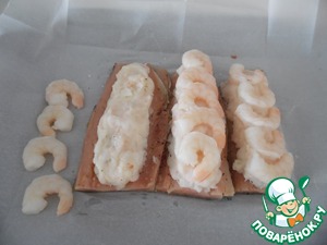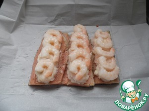 Сначала приготовим фарш из креветок, у меня очищенные, замороженные, разморозить и измельчить в блендере вместе с половиной луковицы, посолить. Отложить несколько штук, чтобы положить их сверху. Затем кусочки рыбы вложить на пекарскую бумагу, посолить, поперчить