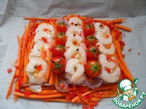 Затем нарезать морковь на тонкие полоски, и перец тоже нарезать кубиками. Выложить морковь между кусочками рыбы и разложить по краям, а также разместить перец и красный лук, нарезанный полукольцами. Затем между кусочками на морковь положить помидоры. Всё полить соком лимона, полить оливковым маслом и выдавить сверху чеснок.