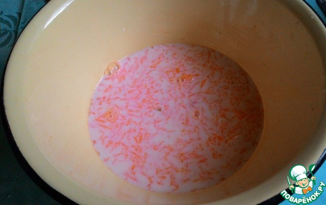 Морковь натереть на средней терке и тушить в сотейнике в молоке примерно 10 мин. В это время кухня заполняется обалденным запахом, обожаю его!