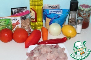 • Подготовить ингредиенты. Нут замочить на 8-12 часов, затем отварить до готовности. Курицу и овощи порезать.