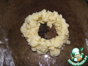 На противень кладем бумагу, или коврик, смазываем растительным маслом, с помощью кондитерского мешка делаем корзиночку из картофельного пюре. Ставим в разогретую духовку, 220-230%, и запекаем до золотистого цвета