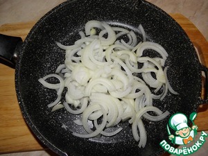 Пока готовится гарнир, приступаем к печени: лук нарезать полукольцами, ( или как вы любите), обжарить на растительном масле до золотистого цвета.