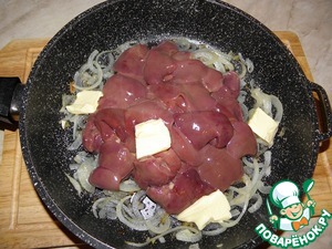 К луку добавить куриную печень, сливочное масло, и обжарить буквально 2-3 минуты, чтоб печень только схватилась.