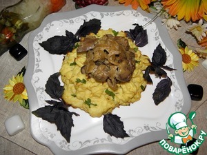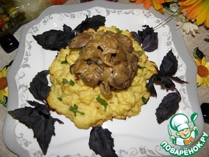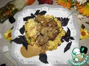 Выложить печень в корзинку из картофельного пюре (зелень, орегано, базилик, по желанию)