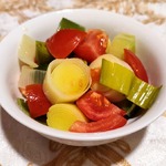 Лук–порей и помидоры перемешать, заправить полученным соусом, дать настояться 10 минут.