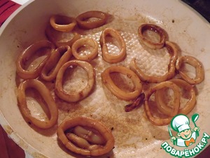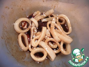 • В полученный маринад выложить кольца кальмаров, оставить мариноваться на 1 час в тёплом месте.