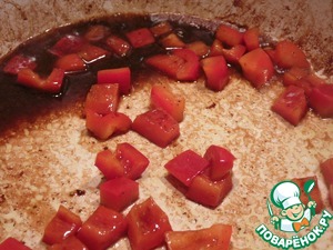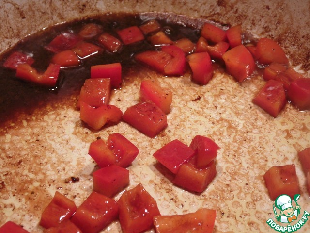 • Перец нарезать небольшими кубиками, залить 2 ст. л. оставшегося после кальмаров маринадом, тушить, помешивая, на небольшом огне 2–3 минуты. Перец выложить к кальмарам, остудить.