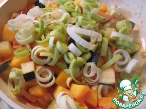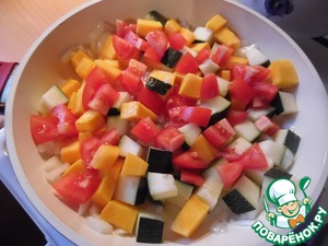 Лук мелко нашинковать, обжарить на растительном масле до прозрачности. Тыкву, кабачок и помидор нарезать кубиками, добавить к луку, обжарить 4-5 минут.