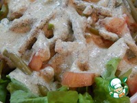 Салат посыпаем сверху вареным яичным желтком и измельченной петрушкой. Поливаем обильно соусом. Салат готов. |
