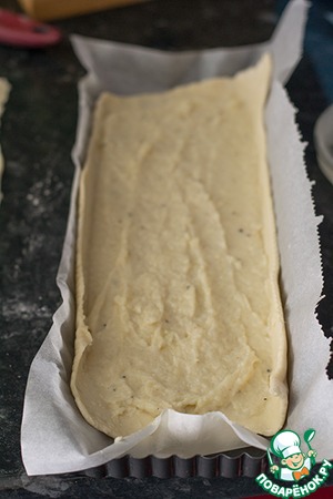 Моя форма - 30х10 см примерно. Значит, раскатать тесто примерно на 30х30 см. Отрезать кусок теста так, чтоб тесто помещалось в форму и по бокам немного выступало. -