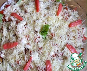 Посыпать салат тертым сыром и украсить кусочками рыбы. В идеале желательно украсить салат сверху вареными креветками, но у меня был эконом - вариант.