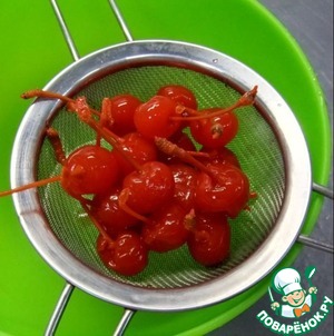 Откинуть коктейльную вишню на сито, чтобы стек сироп.
