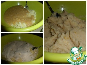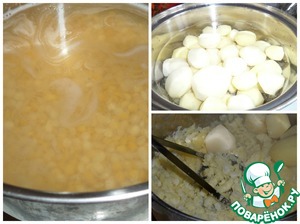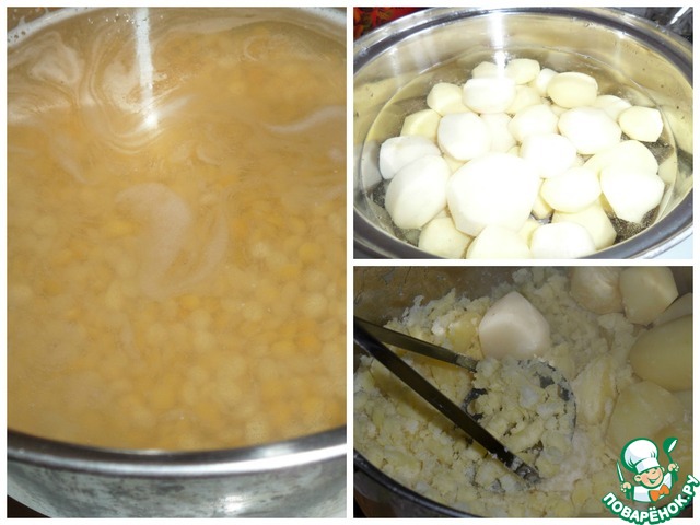 Варим горох до готовности, добавив 1 стакан воды. Солим. Картофель очищаем и варим до готовности. Разминаем картофель, предварительно слив воду, в которой он варился.