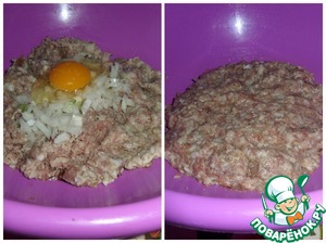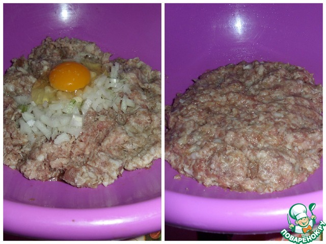 В фарш добавляем яйцо и нарезанный лук. Солим, перчим. Хорошо перемешиваем.