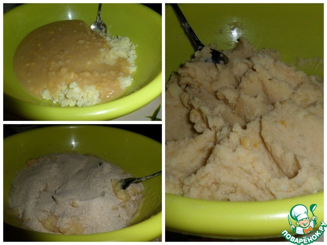 В чашку выкладываем размятый в пюре картофель, добавляем гороховое пюре и 1/4 стакана панировочных сухарей. Хорошо перемешиваем.