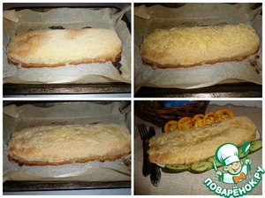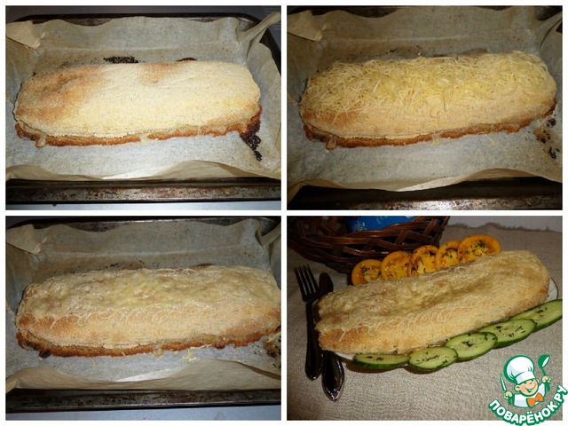 Вынимаем рулет из духовки, посыпаем натертым сыром и возвращаем в духовку на 5-10 минут. Немного остужаем и подаем.
