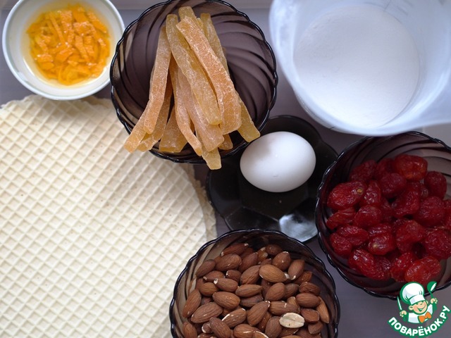 Приготовить необходимые продукты. У меня были цукаты из дыни (как того и требует оригинальная рецептура) и цукаты из кизила. Но, согласно рецептам, можно использовать также курагу, цукаты апельсина и любые другие цукаты или их смесь.