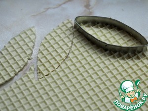 Взять формочку для печенья и нарезать заготовки для наших будущих конфет. У меня нашлась дома такая форма, которая похожа на настоящие калиссоны, но только бОльшего размера, чем требуется по нормам французских кулинаров, а вы можете взять любую форму, которая вам понравится. Вместо листочков рисовый мацы (которая требуется по оригинальному варианту рецепта, и которую у нас не найти днем с огнем), на нижний слой калиссонов я приспособила готовый тонкий вафельный корж.