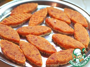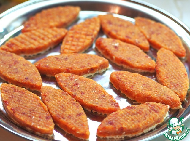 С дынными цукатами меня постигла неудача при попытки сначала нанести на вафельный корж тесто и глазурь, а потом вырубать форму... К сожалению глазурь или размазывалась по изделию, либо крошилась, при нарезке после подсыхания...