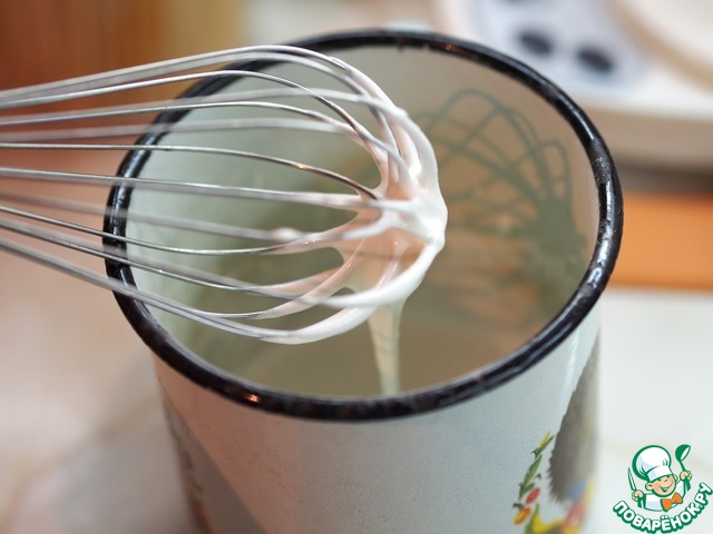 Приготовить королевскую глазурь. Для этого взбить миксером белок от 1 яйца с сахарной пудрой и лимонным соком. Взбивать, пока масса не станет блестящей и однородной.