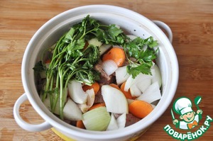 Добавляем соль, все вышеперечисленные приправы: перец, тимьян, майоран, лавровый лист и пучок зелени. Заливаем белым сухим вином.