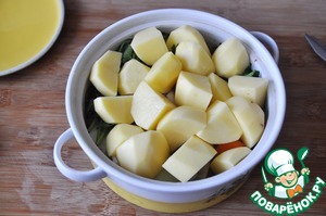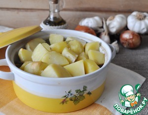 Сверху кладём крупнопорезанный картофель. В оригинале ещё кладут сверху четвертинки груши.