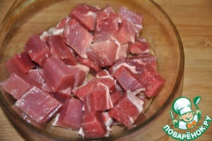 Средними кусочками режем мякоть свинины, баранины и говядины. -