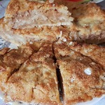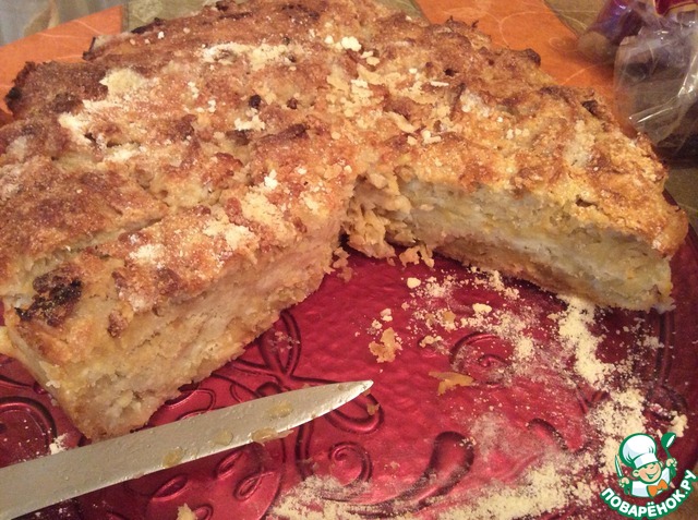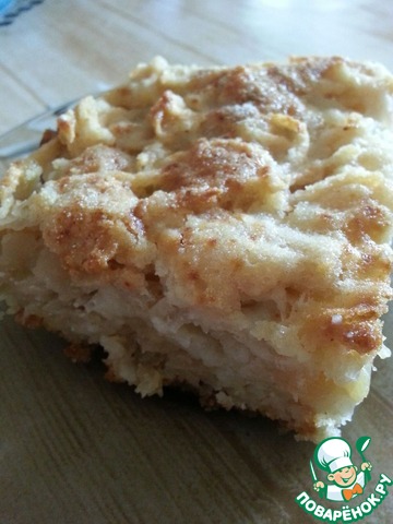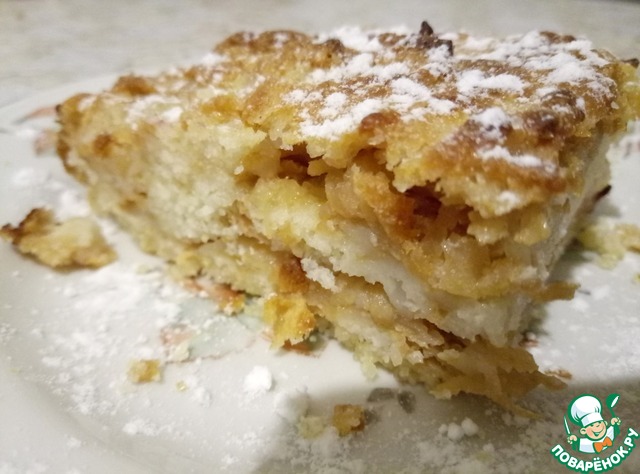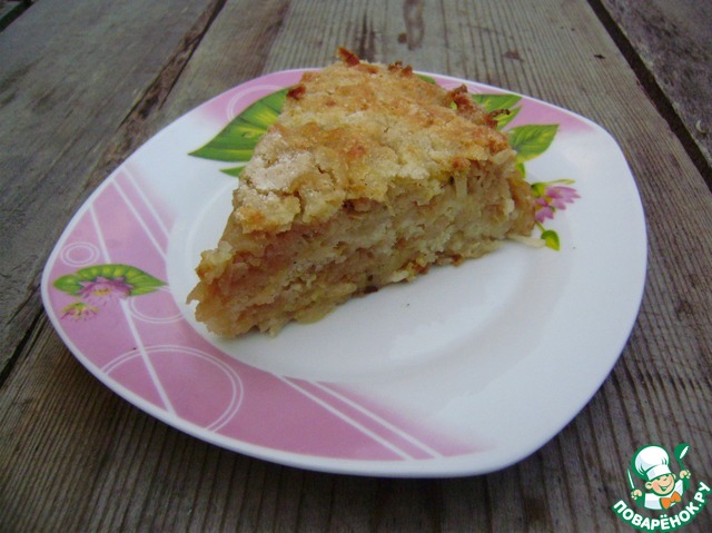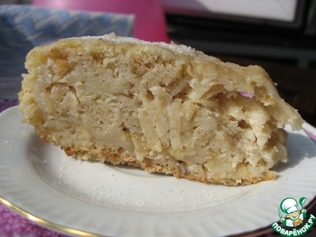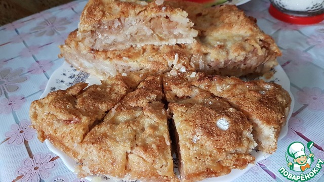 На сайте есть много вариантов насыпного или болгарского яблочного пирога. Готовила не по одному рецепту. Однажды на хорватском сайте нашла этот рецепт, результат меня порадовал больше (проверила, этого варианта не нашла). Пирог получается нежный и ароматный, пропитанный яблочным соком, больше похожий на пудинг. По размеру пирог получается довольно большой.