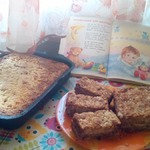 Выпекаю пирог в разогретой до 200 градусов духовке около 15 минут. Вынимаю из духовки, сверху распределяю оставшееся молоко (50 мл), с помощью кулинарной кисти смазываю оставшиеся участки сухой смеси. Снова убираю пирог в духовку.